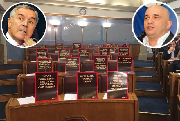 Reagovao je poslanik Demokratskog fronta Milutin Đukanović koji je zahtevao da se sednica prekine. Poslanici Demokratskog fronta napustili su skupštinsku salu, i ostavili transparente na kojima između ostalog piše "Nije samo Marović krao", "Ko je prebio Mija Martinovića", "Crna Gora carstvo korupcije i organizovanog kriminala", "Odakle ti milioni Đukanoviću, dokaži da nisi lopov"...