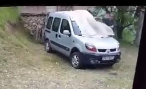 U okolini manastira Morača u Crnoj Gori danas oko 17 sati padao je grad veličine oraha. I dok bi ta činjenica nekome bila dovoljan razlog da ni nos ne promoli napolje, ovom čoveku je automobil bitniji od glave.