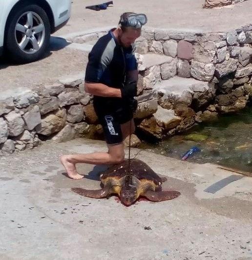 Vidi se ronilac kako stoji iznad vrste "glavata kornjača" koju je ubio probovši joj glavu.