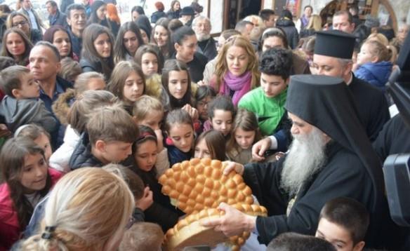 On je ispred Sabornog hrama sa decom prelomio božićnu česnicu.