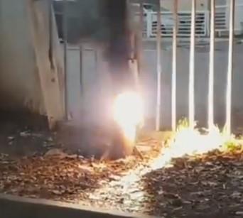 Kao što se može videti u snimku, buknula je vatra, a u pozadini videa se čuju glasovi i jedan mladić koji u polušaljivom tonu viče "Bežite, gospođo!".