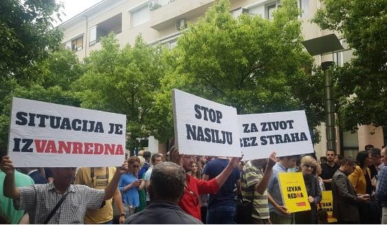 Osim kolega novinara, prisutni su i predstavnici opozicionih političkih partija i nevladinog sektora.Građani nose transparente na kojima piše "Stop nasilju", "Situacija je izvanredna" "Za život bez straha".