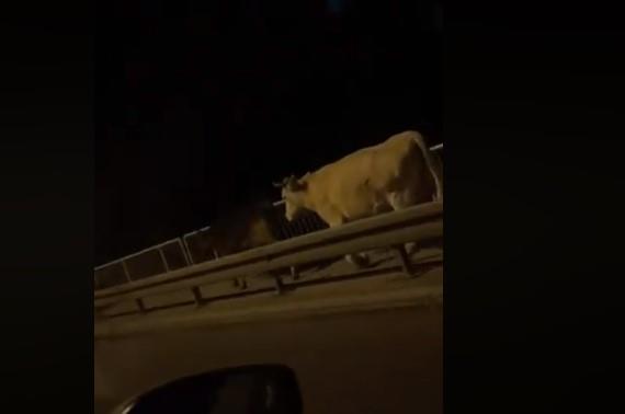 Snimak je napravljen noći, ali je jasno vide kako krave šetaju ne samo kolovozom već i pešačkom stazom.