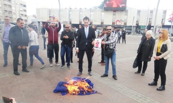 Predsednik Prave Crne Gore Marko Milačić simbolično je zapalio NATO zastavu na Trgu nezavisnosti u Podgorici na dan kada Zapadna alijansa obeležava 70 godina od svog postojanja.