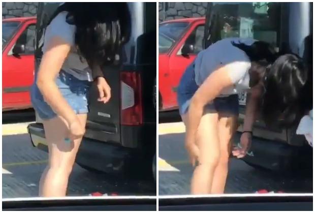 Kako snimak pokazuje, devojka je u poslednji čas izvukla brijač i krenula da sređuje noge na parkingu.