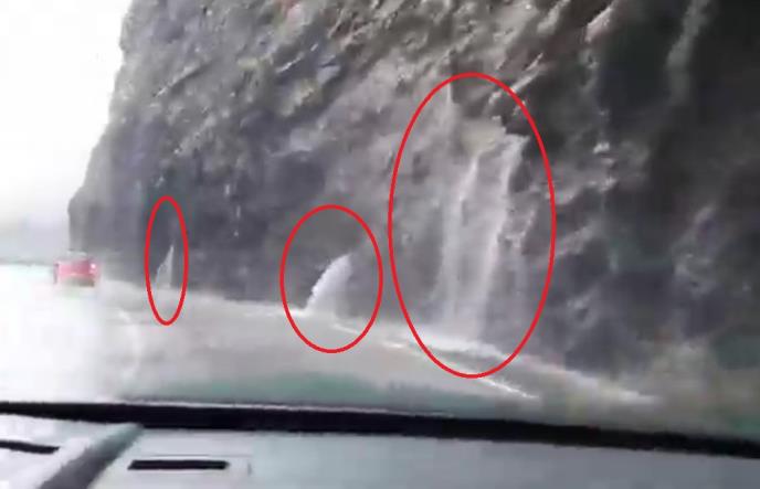 Na ovim snimcima se mogu videti bukvalno vodopadi koji se sa litica spuštaju direktno na kolovoz.