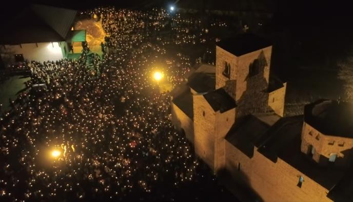 Snimak iz vazduha sinoćnjeg molebana u manastiru Đurđevi stupovi kod Berana pokazuje pravu atmosferu mira, vere i dostojanstva u narodu koji je ustao u zaštitu SPC i njenih svetinja.