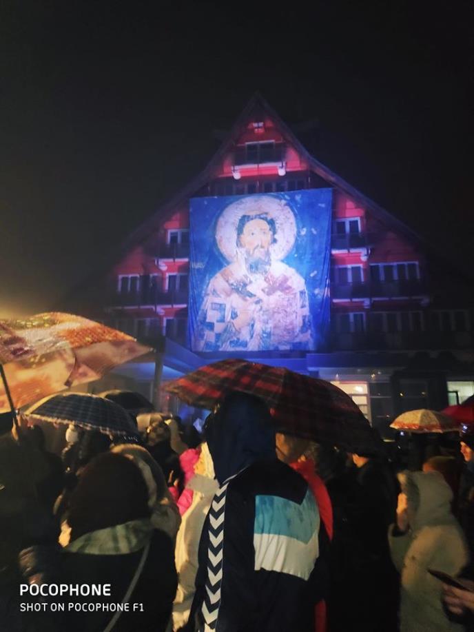 Na fasadi „Hotela Pljevlja“, čiji je vlasnik Predrag Cvijović, odbornik DPS osvanuo je na dan Svetog Save ogroman bilbord sa ikonom tog sveca.