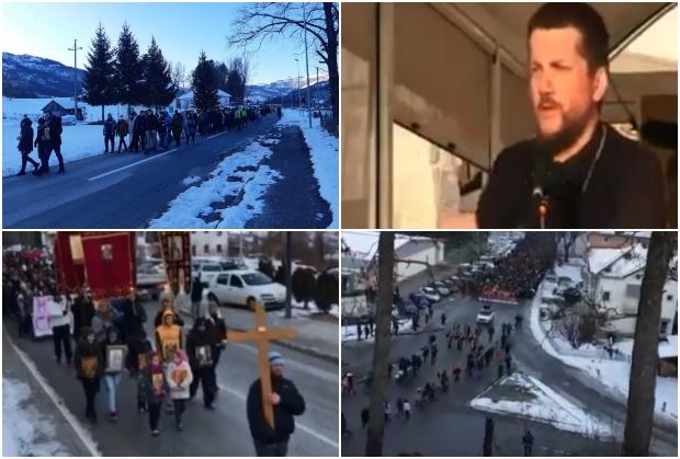 Po hladnoći (minus 11 stepeni Celzijusa) i snegu stanovnici Mojkovca i Žabljaka idu u litiju u odbrani svetinja.