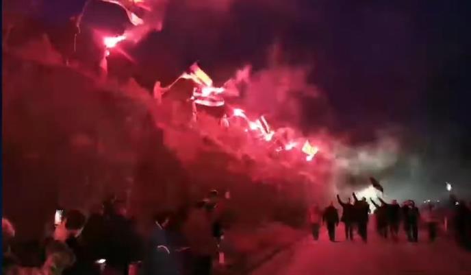 "Ne damo svetinje" zaorilo se na mračnom putu a potom je usledila bakljada i zaviorile se trobojke. Već po ustaljenom običaju krenulo je i nadvikivanje "KOSOVO -SRBIJA".