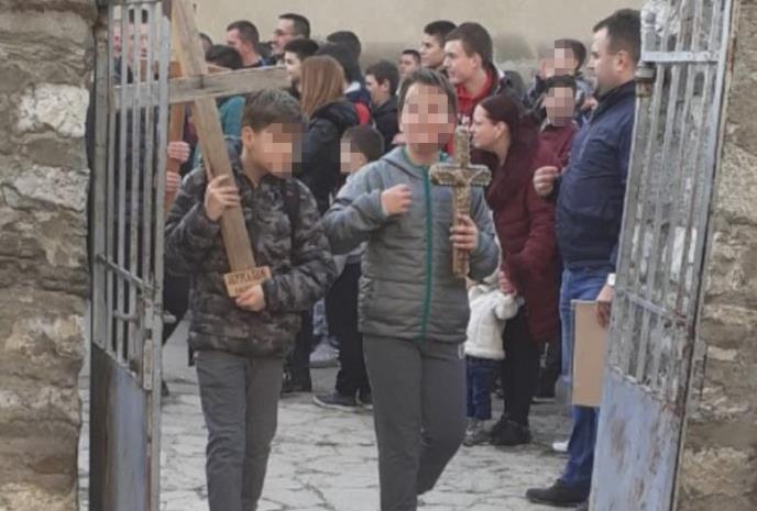Na njoj su 2 dečaka koja ulaze u portu manastira svetog Petra i Pavla u ovom gradu, nakon litije duge 10 km.