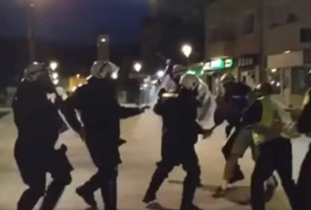 Na jednom od snimaka sa večerašnjeg protesta vidi se da više policajaca sa opremom za razbijanje demonstracija udara pendrecima, rukama i nogama jednog mladića.