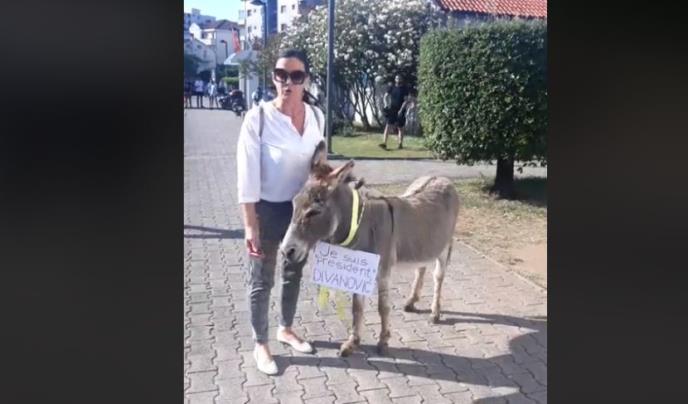 Pošto građani ne mogu u opštini Budva da ispune svoja građanska prava, niti da uđu u zgradu, bivša urednica RTV Budva, Iva Bajković je ispred zgrade Opštine, dovela magarca, kojem oko vrata visi natpis "Je suis president Divanovic".