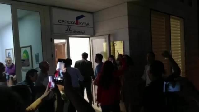 spred izbornog štaba u Srpskoj kući u Podgorici, okupljeni su članovi koalicije koji, uz pesmu, slave pobedu.