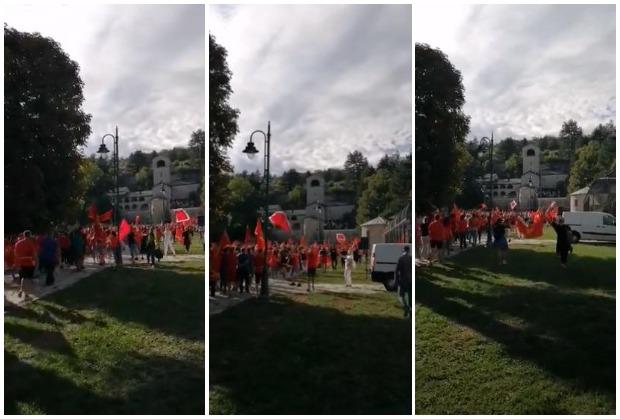 17.27 - Kolona automobila sa crnogorskim obeležjima prolazi Njegoševom ulicom na Cetinju uoči skupa, a grupa građana formirala je živi lanac kako niko ne bi mogao da priđe Cetinjskom manastiru