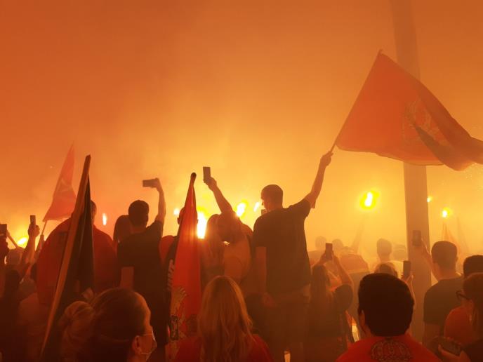 U Podgorici, na Trgu nezavisnosti, počeo je oko 19 časova postizborni "patriotski skup" iza kojeg stoji, kako se smatra, DPS predsednika Mila Đukanovića, koja je poražena na nedavnim parlamentarnim izborima.