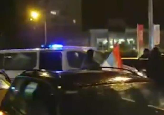 Dve policijske marice zaustavile su se, sa rotacionim svetlima, ispred štaba i policajci su pokušali da rasteraju građane.