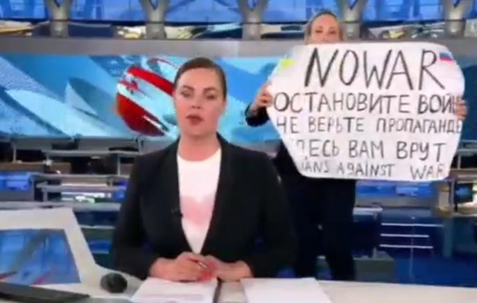 U ponedeljak, 14. marta, tokom trajanja emisije "Vremja" koju je vodila Andrejeva, iza njenih ledja u kadru pojavila se Marina Ovsjanikova sa natpisom "Ne ratu, zaustavite rat".