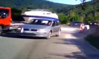 Automobil je krenuo u preticanje vozila sa prikolicom, na kojoj se nalazi čamac, i za dlaku je uspeo da izbegne direktan sudar, vrativši se u poslednji čas u svoju traku.