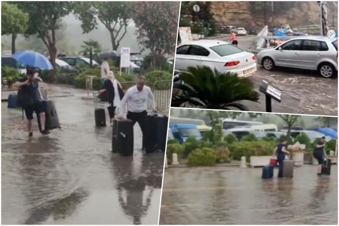 NEVREME PRAVI HAOS U CRNOJ GORI: Ulice pod vodom, drama i ispred aerodroma u Tivtu, turisti NOSE KOFERE kroz bare (VIDEO)