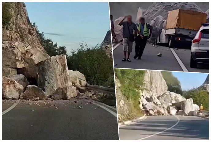 Na fotografijama koje su zabeležili učesnici u saobraćaju, može se videti da je celi kolovoz prekriven odronjenim stenama.