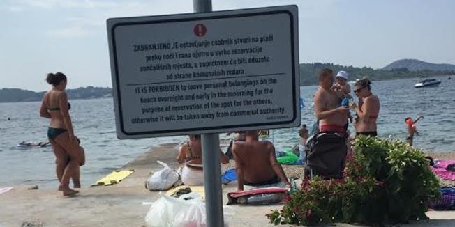 VODICE - Table koje je rukovodstvo Vodica postavilo na plaže, a kojima se kupači upozoravaju da ne ostavljaju peškire i suncobrane preko noći na plažama, izazvale su podsmeh stranih turista, pre svega onih koji dobro znaju engleski.