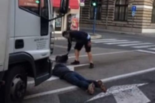 RIJEKA - Mladića koji je legao na put i sprečio prolaz vozilima snimila je Sabrina Bačič u Rijeci jutros kad je išla na posao. Snimak je objavila na svom Fejsbuk profilu.