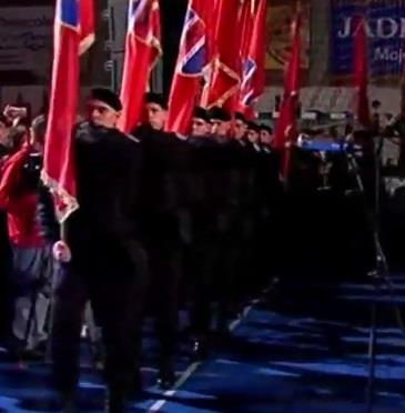 Pripadnici Slavonske sokolske garde, koji su podsećaju na ustaške jedinice iz Drugog svetskog rata, stajali su nepomično držeći hrvatske i zastave HDS SB