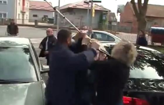 Kako se može videti na snimku verbalni sukob prešao je u fizički, prvo su pali šamari, a onda je jedan muškarac oteo od žene štaku sa kojom kreće u juriš.