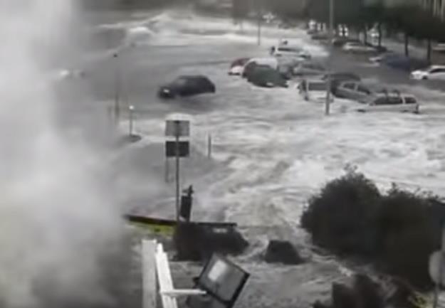 Zastrašujuće udare talasa koji automobile nose kao da su igračke snimio je jedan meštanin koji je snimak okačio na Jutjub.