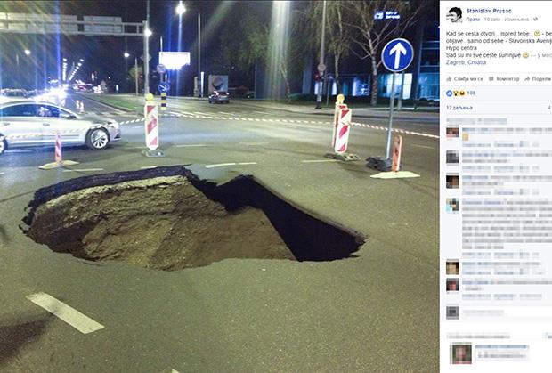 Nekoliko metara asfalta jednostavno je propalo u zemlju, a srećom niko se nije u tom trenutku nalazio nalazio na sredini raskrsnice. Radnici Zagreb puta postavili su signalizaciju i ogradili pravi mali ponor, dubok nekoliko metara.