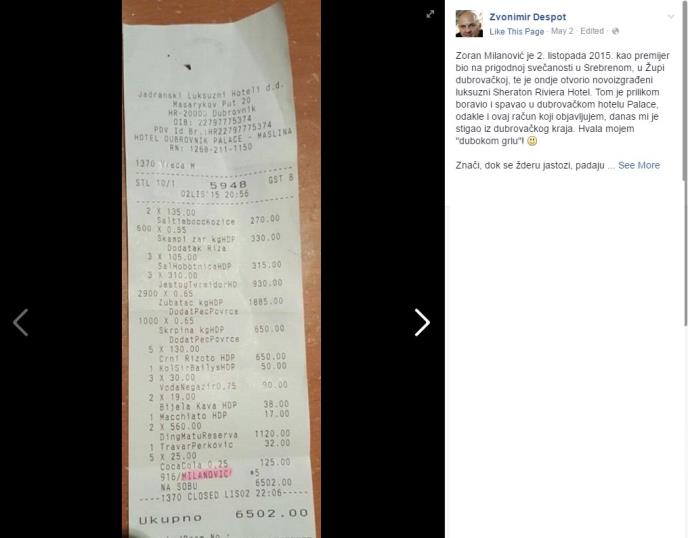 Novinar Zvonimir Despot je na svom Fejsbuku objavio račun Milanovićeve večere sa morskim specijalitetima, težak 865 evra.
