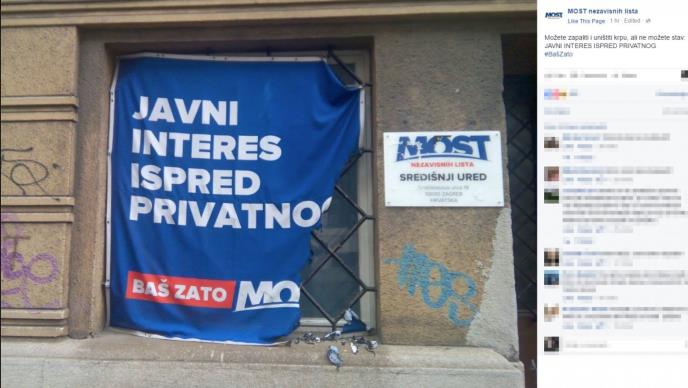 Manja članica hrvatske vladajuće koalicije Most objavila je na svojoj stranici na Fejsbuku fotografiju na kojoj se vidi delimilčno izgoreli transparent, koji se nalazi na prozoru Mostove centrale u Zagrebu.