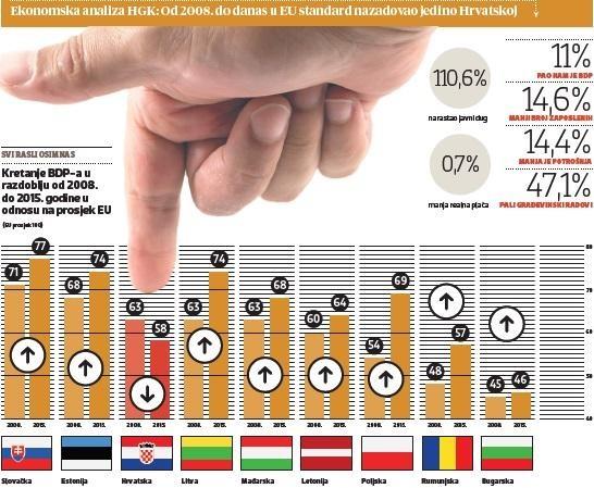 Ovo su podaci koje je objavio Zvonimir Savić, direktor sektora za ekonomske analize u Hrvatskoj privrednoj komori, i koji upozorava da je Hrvatska 2008. bila za trećinu razvijenija od Rumunije. BDP u Hrvatskoj i dalje je 11 posto niži od onog zabeleženog u krizi, a broj zaposlenih je manji 14,6 posto, kao i industrijska proizvodnja. Jedino što se znatno povećalo je javni dug koji se udvostručio tokom krize.