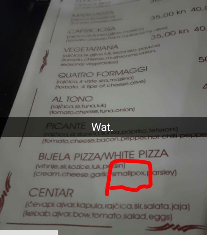 Jeste li zainteresovani za morske plodove ili možda malo boginja na pici? Ukoliko je vjerovati meniju jedne korčulanske picerije, na svom omiljenom obroku možete očekivati upravo to.
