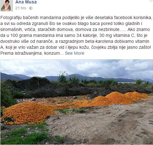Šokantnu fotografiju mandarina bačenih na divlju deponiju u okolini Opuzena objavila je Ana Musa, ekološka aktivistkinja i nezavisna poslanica u Dubrovačko-neretvanskoj županiji i u Gradu Pločama.