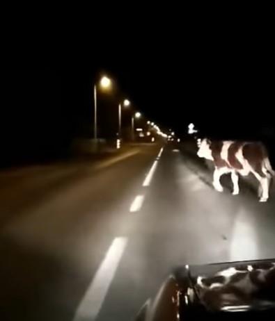 Išla je sredinom puta, pa se ipak vratila u pravu saobraćajnu traku, u levu stranu. Usporili su, a zbunjena kravica nije htela da se pomeri.