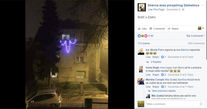 Svetleći ukras koji visi s balkona jedne zgrade u Zadru poprimio je oblik koji je kod prolaznika izazvao navale smeha, a da li je neko odlučio da se našali ukrasivši na ovaj način fasadu zgrade ili ni sam nije bio svestan svoje dekoratske omaške, preostaje nam samo da nagađamo ili da se nasmejemo dobroj šali - namernoj ili slučajnoj.
