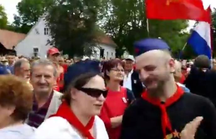 Mnogi su odeveni u uniforme JNA, a s razglasa se čuju Titovi govori i borbene jugoslovenske pesme.