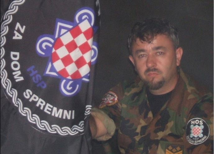 Markuš je na fotografiji odeven u maskirnu uniformu, a na ramenu je jasno istaknut simbol HOS-a, dok u ruci drži crnu zastavu s HOS-ovim grbom na kojem je istaknut ustaški pozdrav "za dom spremni".