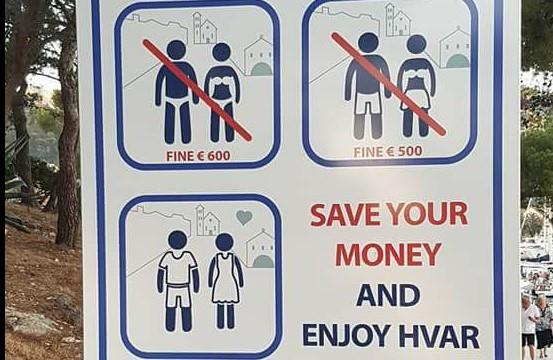 Na ulazu u Hvar ovog vikenda osvanula je tabla s upozorenjem gostima i kaznama koje ih očekuju u slučaju neprimerenog ponašanja. Ko bude po gradu šetao u kupaćem kostimu, platiće do 600 evra, žene u gornjem delu kupaćeg kostima i muškarci golog torza do 500 evra, a onaj ko tetura ulicom s flašom u ruci i pijan leži na ulici do 700 evra.