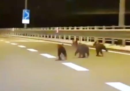 Tri mala medveda zalutali su i našli se u sred noći na riječkoj zaobilaznici iznad gradića Bakar, na Hrvatskom primorju, gde ih je jedan vozač snimio kako trče sredinom puta, ispred automobila.