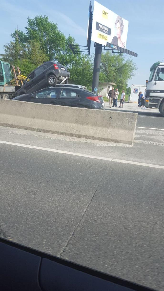 Fotografije sa mesta događaja pokazuju da je jedan automobil odleteo na krov drugog.