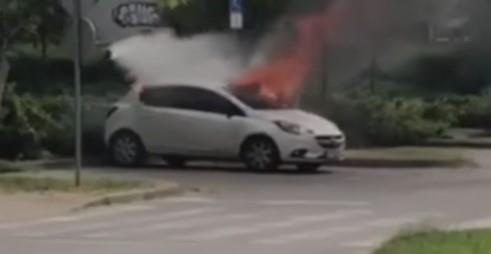"To je bilo na parkingu. Primetio sam da se nešto dimi. Prišao sam bliže i video da dim suklja iz prtljažnika belog Opela. Pored automobila je bio i vlasnik. Delovao je kao da ne zna šta da radi. Mahao je rukama, kao da pokušava da ugasi požar", kaže prolaznik koji je snimio požar.