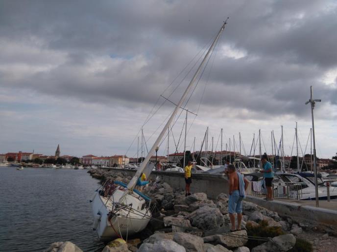 Slovenačkim državljanina iz Pirana je zbog jakog vetra pukao konopac, odnosno, ceo stub za koji su bili zavezani, pa je njihova jedrilica završila na stenama porečke marine.
