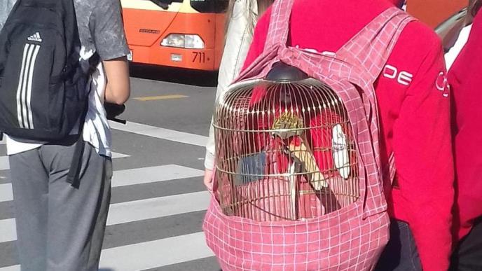 Jedna žena je privukla je veliku pažnju Riječana kada je gradom šetala noseći na leđima posebno dizajniran ranac u kojem se nalazio kavez sa dva papagaja.