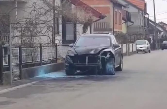 Nepoznati piroman prišuljao se u ponedeljak oko ponoći lukuznom automobilu "porše kajenu" nemačkih registracija. Polio ga je zapaljivom tečnošću i zapalio.