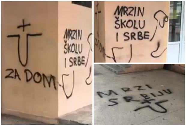 "Mrzin školu i Srbe", piše na zidu kod ulaznih vrata. Cela vrata su takođe išarana crnim sprejem.