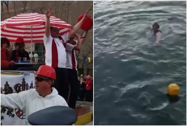 Muškarci obučeni u dresove Crvene zvezde su imitirali sramotni događaj koji se nedavno odigrao na splitskoj Rivi. Zvezdaše su ovoj tački napali ljudi u trenerkama i sa palicama u ruci, posle čega je jedan zvezdaš skočio u more.