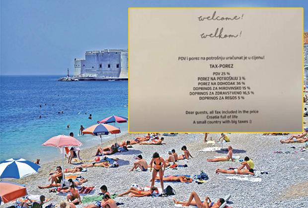 Na kraju je na engleskom napisao “Dragi gosti, svi su porezi uključeni u cenu. Hrvatska puna života. Mala zemlja s velikim porezima.”